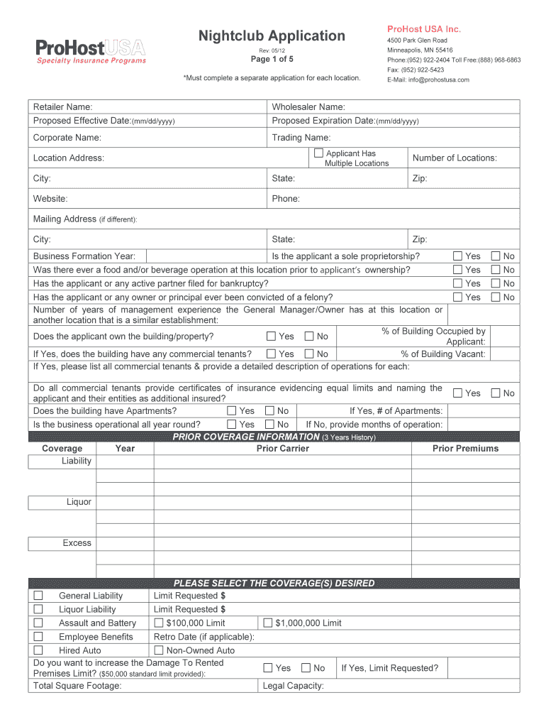 Nightclub Application Rev: 05/12-Page 1 of 5 Provost USA Inc. 4500 Park Glen Road Minneapolis, MN 55416 Phone:(952) 9222404 Toll Free:(888) 9686863 *Must complete a separate application for each location.