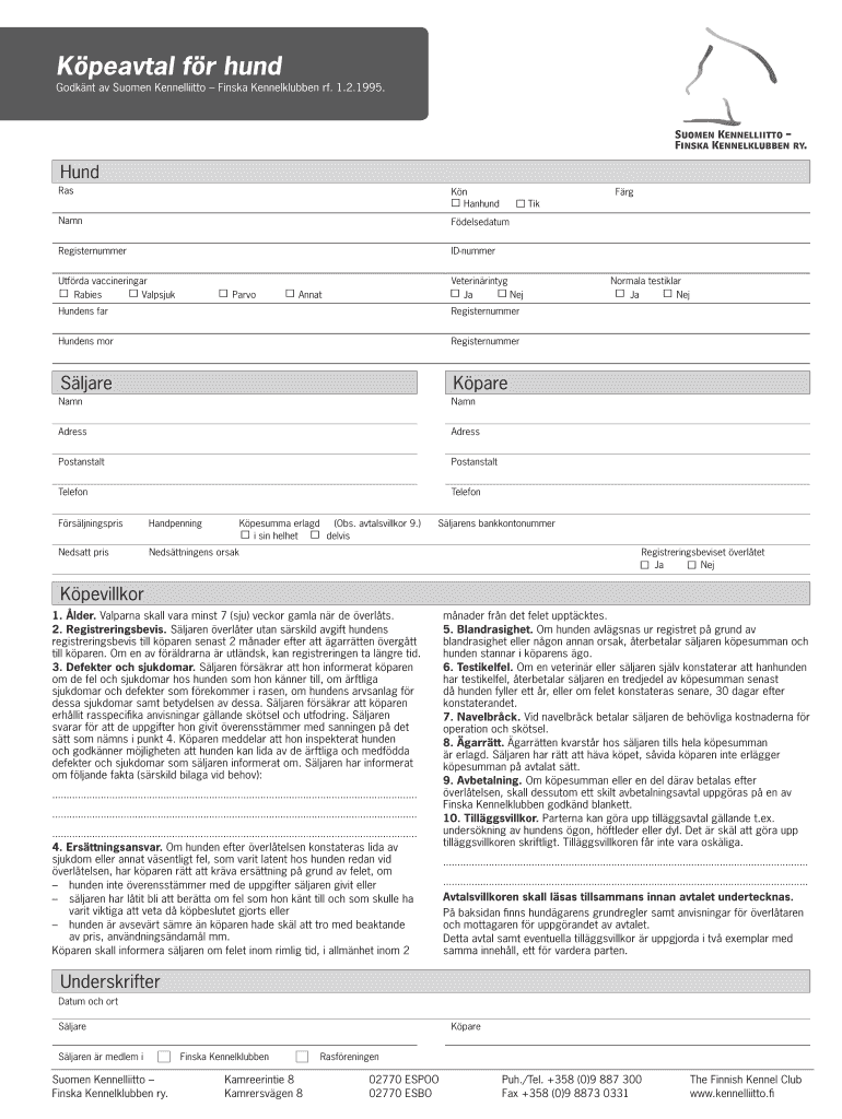 Get the free Kpeavtal fr hund - Suomen Kennelliitto