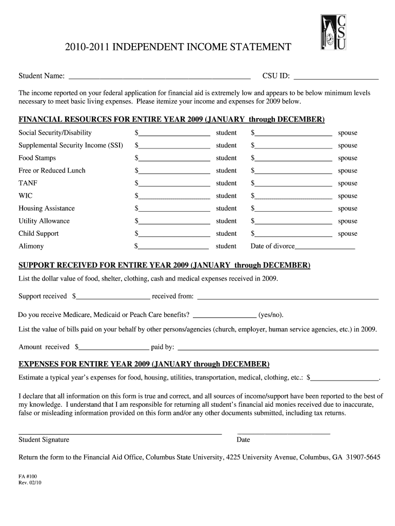 Get the free 2010-2011 INDEPENDENT INCOME STATEMENT - finaid columbusstate