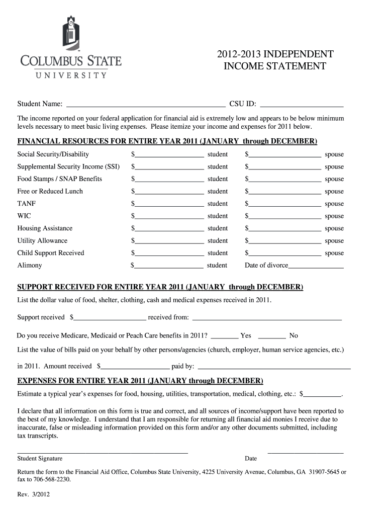 Get the free 2012-2013 INDEPENDENT INCOME STATEMENT - finaid columbusstate