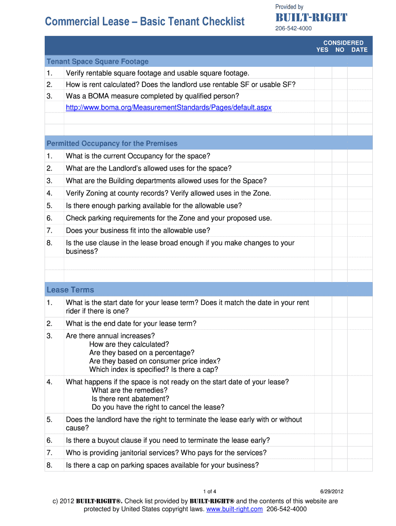 Provided commercial Lease Basic Tenant ChecklistBUILTRIGHT 2065424000 CONSIDERED YES NO Attendant Space Square Footage 1. Verify rentable square footage and usable square footage.2. How is rent calculated?