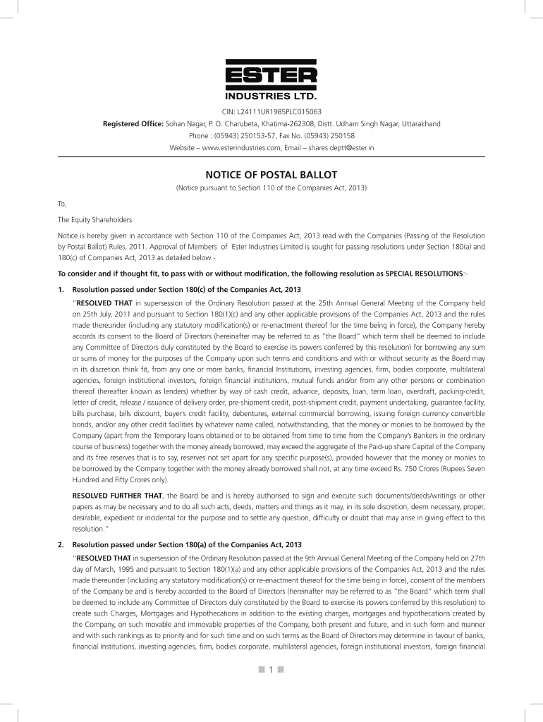 Get the free Notice of Postal Ballot and Form - Ester Industries Ltd