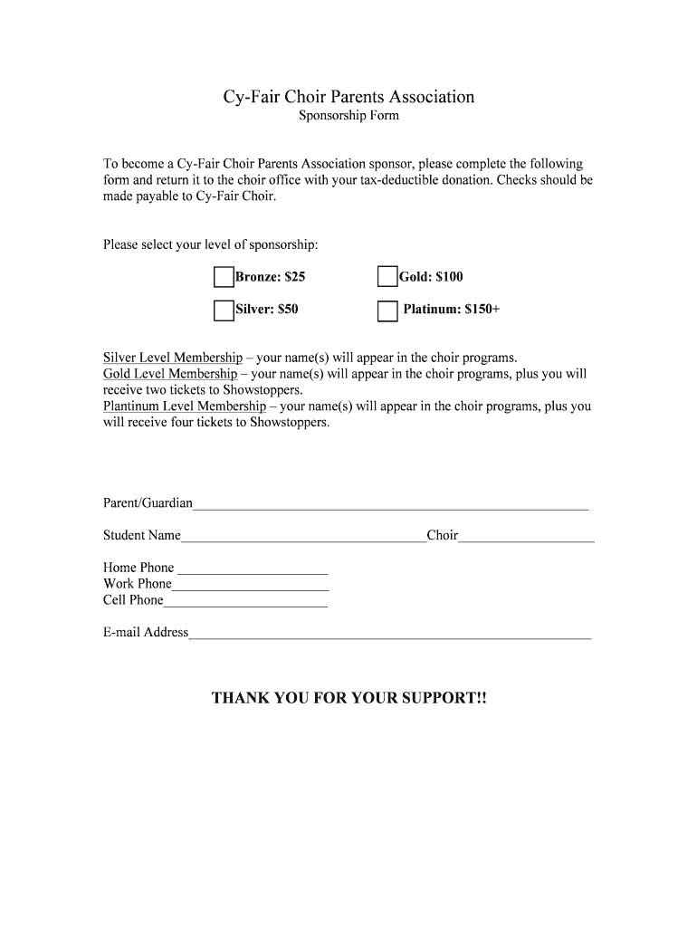 Year Choir Parents Association Sponsorship Form To become a Year Choir Parents Association sponsor, please complete the following form and return it to the choir office with your tax-deductible donation.