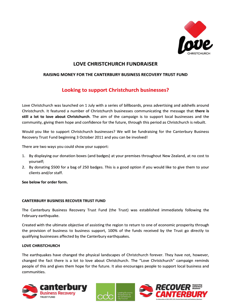 LOVE CHRISTCHURCH FUNDRAISER RAISING MONEY FOR THE CANTERBURY BUSINESS RECOVERY TRUST FUND Looking to support Christchurch businesses? Love Christchurch was launched on 1 July with a series of billboards,