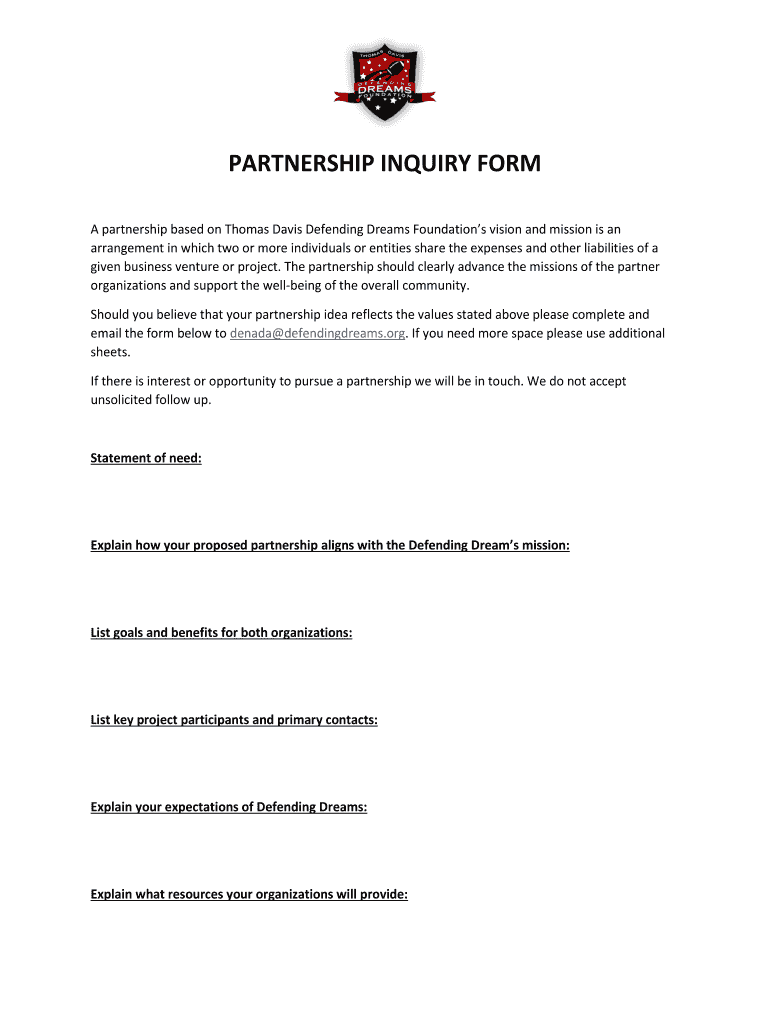 Get the free PARTNERSHIP INQUIRY FORM - defendingdreamsorg