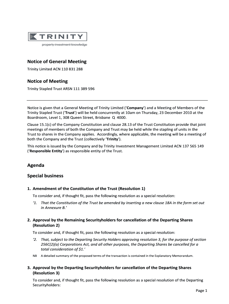 Notice of General Meeting Trinity Limited ACN 110 831 288 Notice of Meeting Trinity Stapled Trust ARSON 111 389 596 Notice is given that a General Meeting of Trinity Limited (Company) and a Meeting