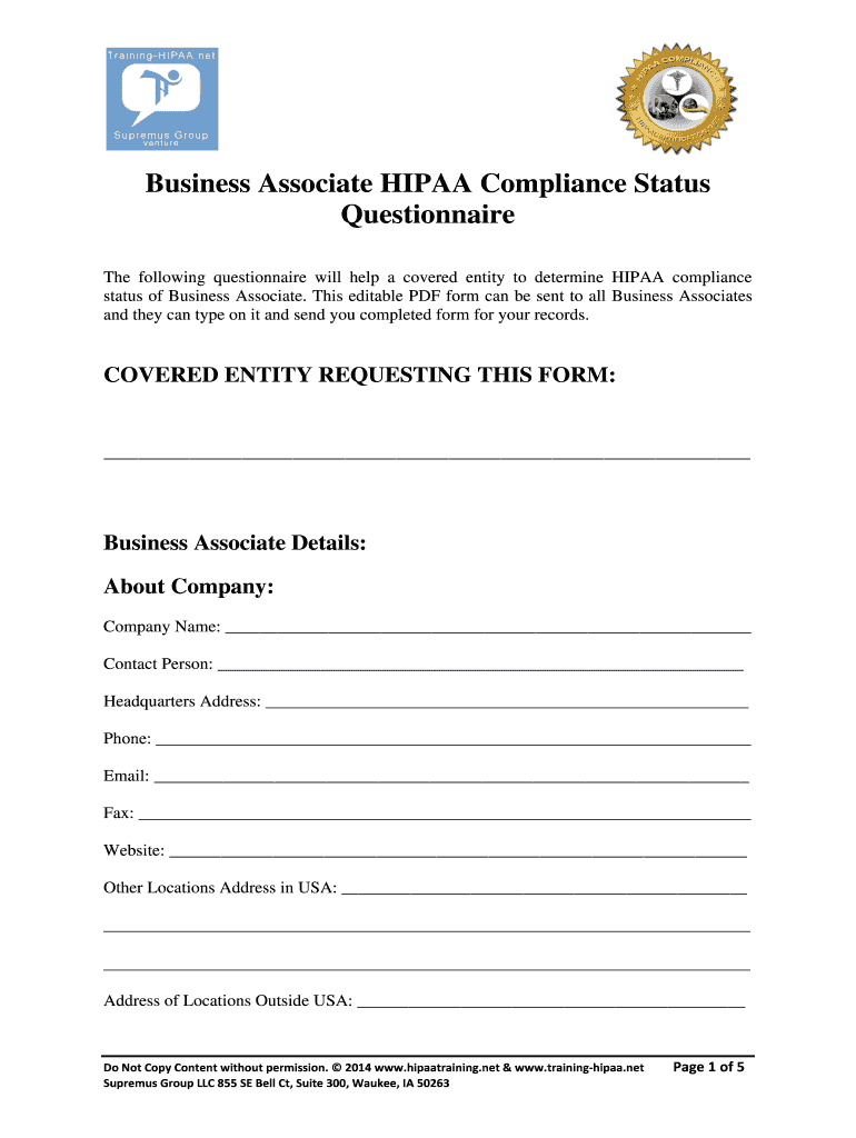 Business Associate HIPAA Compliance Status Questionnaire The following questionnaire will help a covered entity to determine HIPAA compliance status of Business Associate. This editable PDF form can