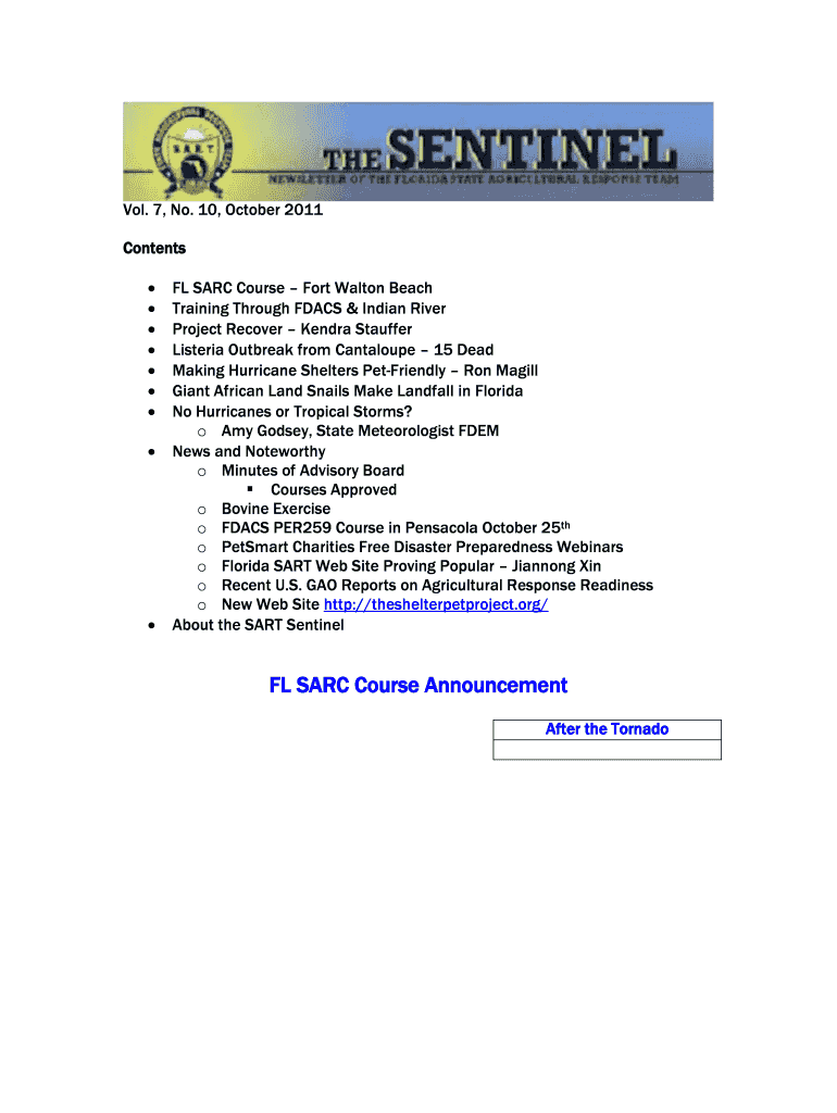 Vol. 7, No. 10, October 2011 Contents FLS ARC Course Fort Walton Beach Training Through FD ACS & Indian River Project Recover Kendra Stauffer Listeria Outbreak from Cantaloupe 15 Dead Making Hurricane