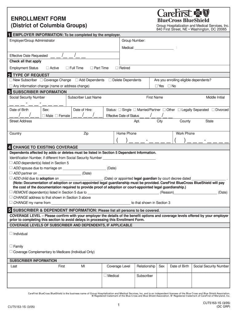 The CareFirst BlueCross BlueShield Enrollment Form plays a crucial role in enrolling individuals in health insurance coverage in the District of Columbia. This form is vital for securing health benefits offered by employers, ensuring that employees can select and manage their health plans effectively. The carefirst enrollment form serves as the official documentation necessary for enrolling in health insurance programs provided by CareFirst, including those specific to DC health insurance plans.