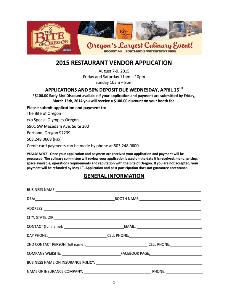 2015 RESTAURANT VENDOR APPLICATION August 79, 2015 Friday and Saturday 11am 10pm Sunday 10am 8pm APPLICATIONS AND 50% DEPOSIT DUE WEDNESDAY, APRIL 15TH *$100.00 Early Bird Discount available if your