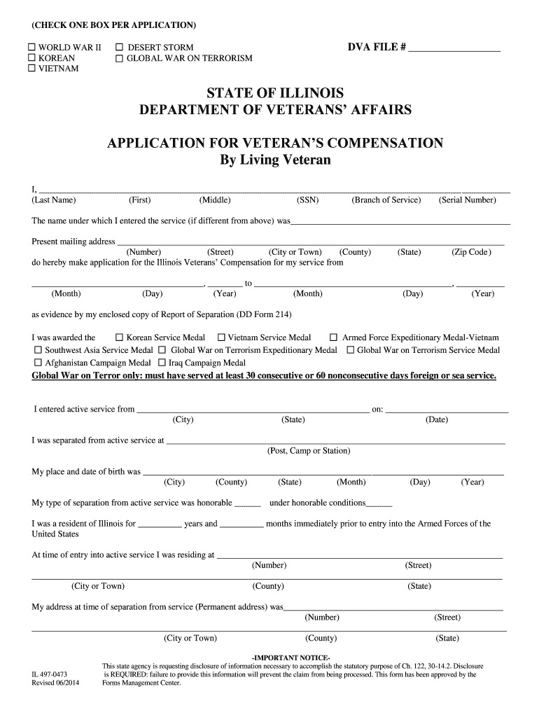 (CHECK ONE BOX PER APPLICATION) WORLD WAR II KOREAN VIETNAM DVA FILE # DESERT STORM GLOBAL WAR ON TERRORISM STATE OF ILLINOIS DEPARTMENT OF VETERANS AFFAIRS APPLICATION FOR VETERANS COMPENSATION By