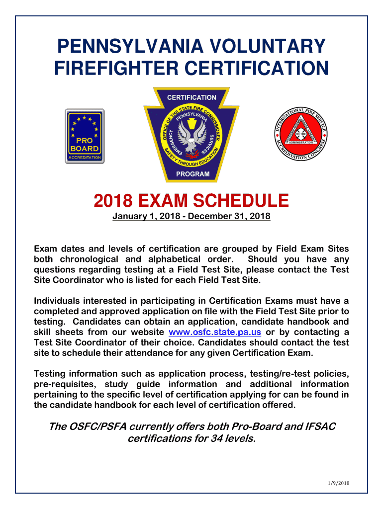 PENNSYLVANIA VOLUNTARY FIREFIGHTER CERTIFICATION2018 EXAM SCHEDULE January 1, 2018, December 31, 2018, Exam dates and levels of certification are grouped by Field Exam Sites both chronological and