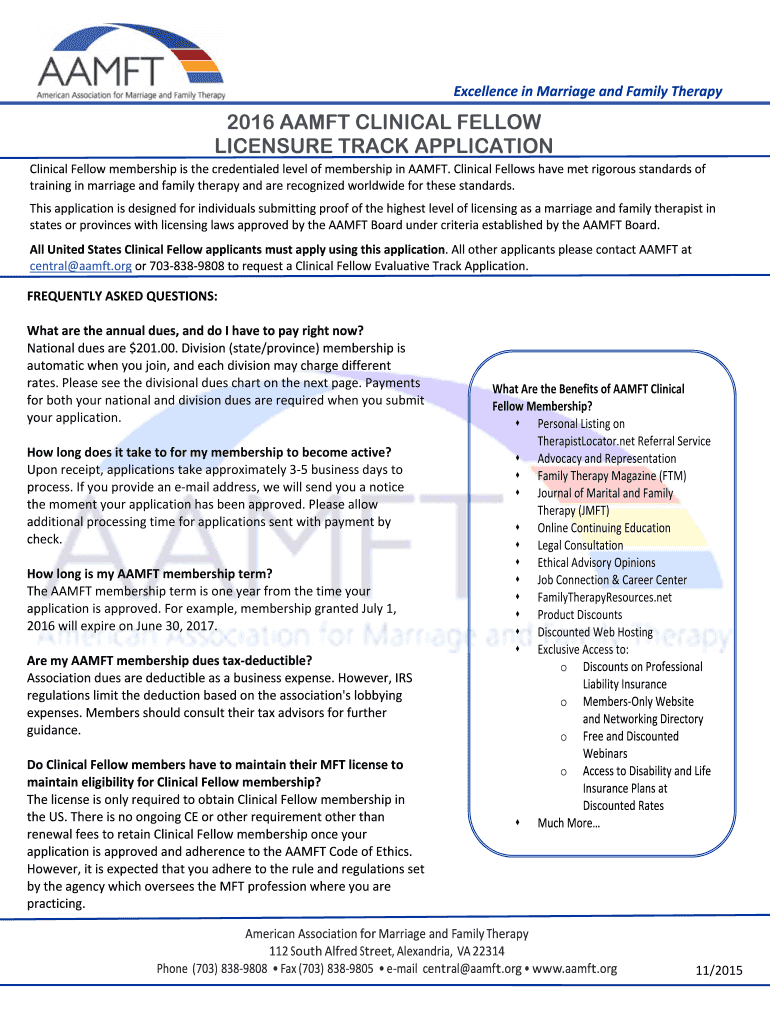 Excellence inMarriageandFamilyTherapy 2016 AA MFT CLINICAL FELLOW LICENSURE TRACK APPLICATION ClinicalFellowmembershipisthecredentialedlevelofmembershipinAAMFT. ClinicalFellowshavemetrigorousstandardsof