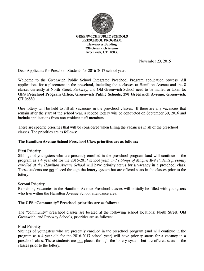 GREENWICH PUBLIC SCHOOLS PRESCHOOL PROGRAM Homemaker Building 290 Greenwich Avenue Greenwich, CT 06830 November 23, 2015, Dear Applicants for Preschool Students for 20162017 school year: Welcome to