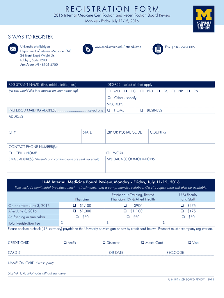 R E G I S T R AT I O N F O R M 2016 Internal Medicine Certification and Recertification Board Review Monday Friday, July 1115, 2016 3 WAYS TO REGISTER University of Michigan Department of Internal