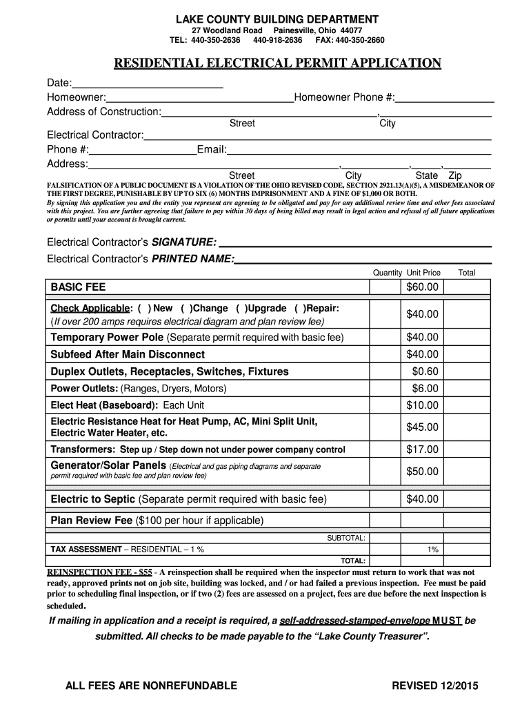 LAKE COUNTY BUILDING DEPARTMENT 27 Woodland Road Painesville, Ohio 44077 TEL: 4403502636 4409182636 Faxes: 4403502660 RESIDENTIAL ELECTRICAL PERMIT APPLICATION Date: Homeowner: Address of Construction: