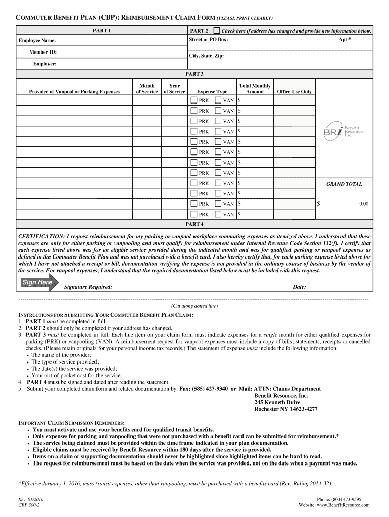 COMMUTER BENEFIT PLAN (CBP): REIMBURSEMENT CLAIM FORM (PLEASE PRINT CLEARLY) PART 1 PART 2 Check here if address has changed and provide new information below. Street or PO Box: Employee Name: Member
