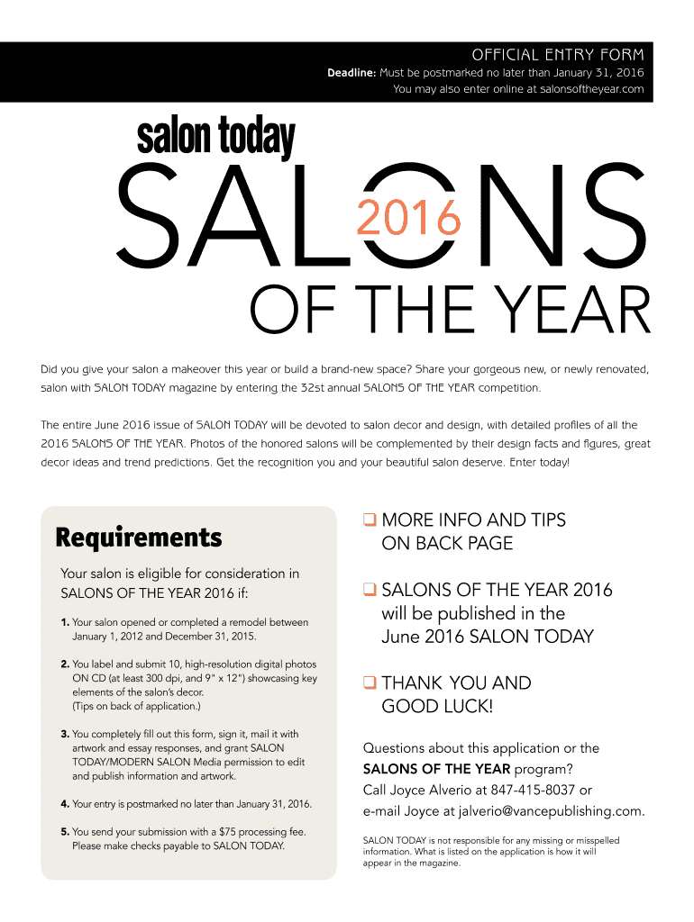 OFFICIAL ENTRY FORM Deadline: Must be postmarked no later than January 31, 2016, You may also enter online at salonsoftheyear.com SALONS OF THE YEAR 2016 Did you give your salon a makeover this year