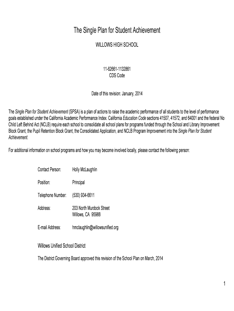 The Single Plan for Student Achievement WILLOWS HIGH SCHOOL 11-62661-1132861 CDS Code Date of this revision: January 2014 The Single Plan for Student Achievement (SPA) is a plan of actions to raise