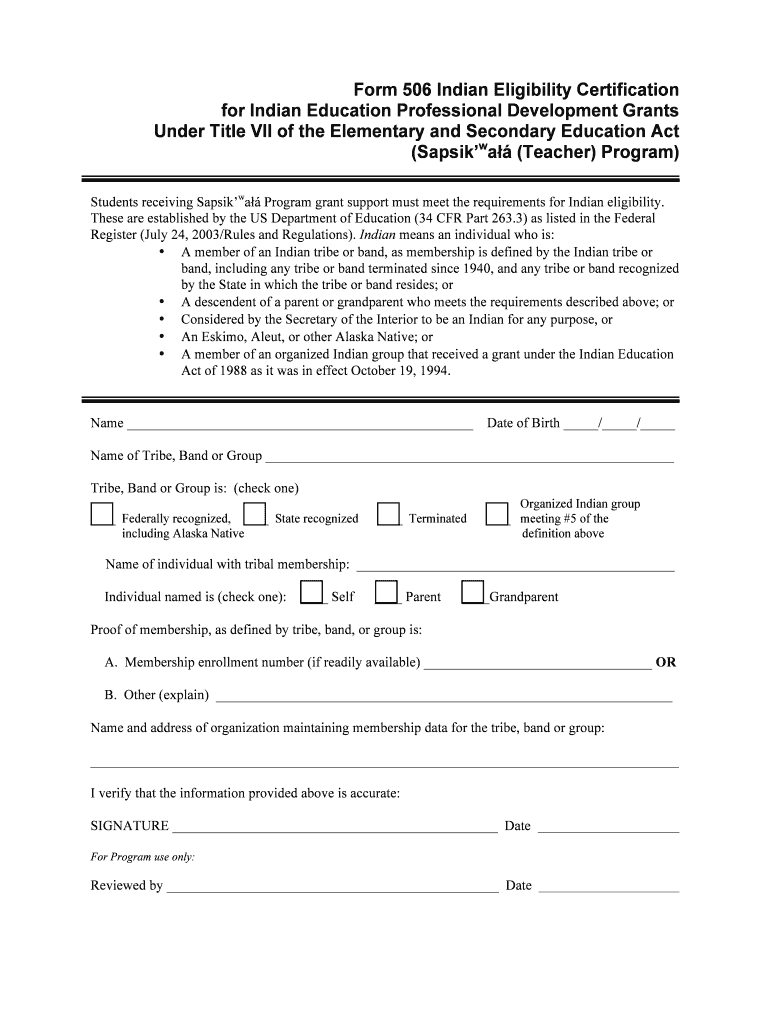 Form 506 Indian Eligibility Certification for Indian Education Professional Development Grants Under Title VII of the Elementary and Secondary Education Act (Paprika (Teacher) Program) Students receiving