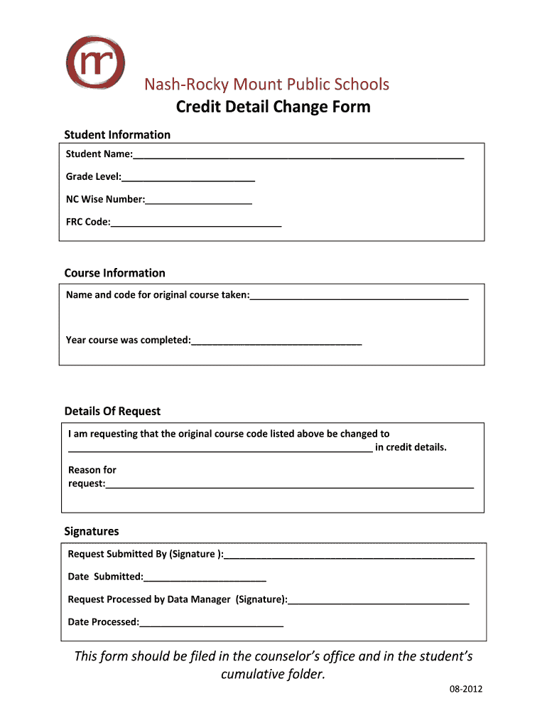 Nash Rocky Mount Public Schools Credit Detail Change Form Student Information Student Name: Grade Level: NC Wise Number: FRC Code: Course Information Name and code for original course taken: Year