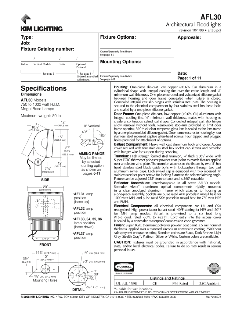 Reset Form AFL30 Architectural Floodlights revision 10/1/08 afl30.pdf Type: Job: Fixture Catalog number: / Fixture Options: Ordered Separately from Fixture See pages 45 / / Finish Electrical Module