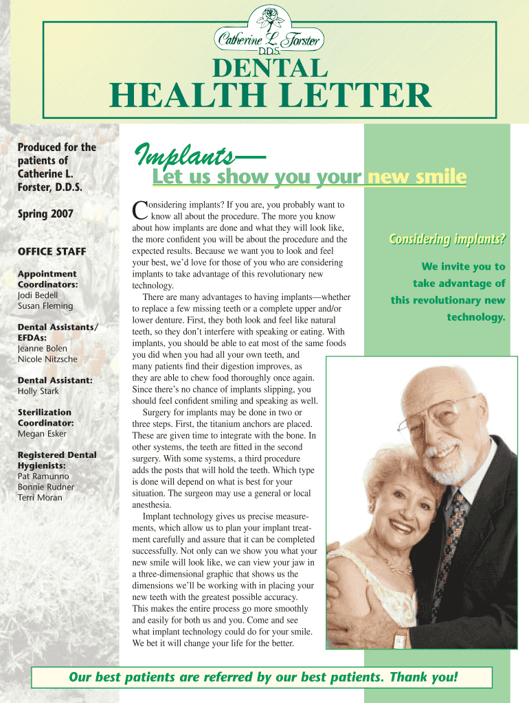 DENTAL HEALTH LETTER Produced for the patients of Catherine L. Forster, D.D.S. Spring 2007 OFFICE STAFF Appointment Coordinators: Jodi Befell Susan Fleming Dental Assistants/ EFAs: Jeanne Bowen Nicole