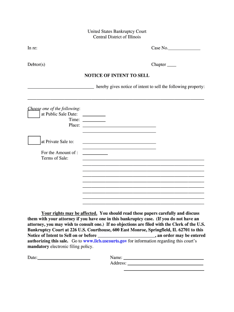 United States Bankruptcy Court Central District of Illinois In re: Case No. Debtor(s) Chapter NOTICE OF INTENT TO SELL hereby gives notice of intent to sell the following property: Choose one of the