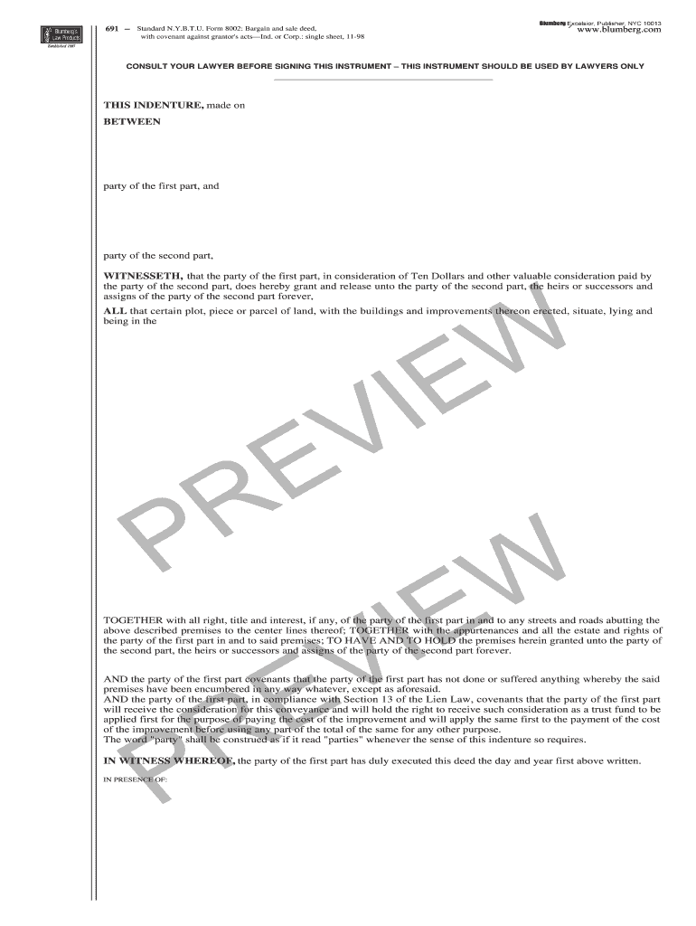 Reset Show Field Borders Purchase 691 Standard N.Y.B.T.U. Form 8002: Bargain and sale deed, Click Here www.blumberg.com with covenant against granter's acts Ind. Or Corp.: single sheet, 1198 CONSULT