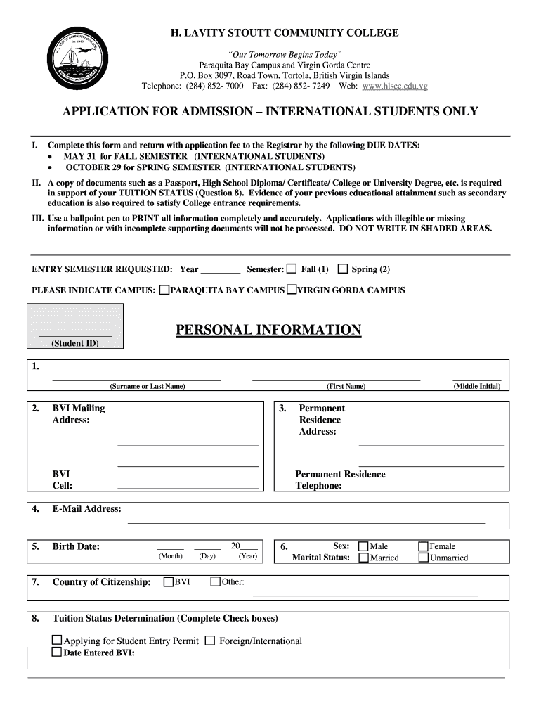 H. CAVITY STOUT COMMUNITY COLLEGE Our Tomorrow Begins Today Paraquat Bay Campus and Virgin Golda Center P.O. Box 3097, Road Town, Tortola, British Virgin Islands Telephone: (284) 852 7000 Fax: (284)