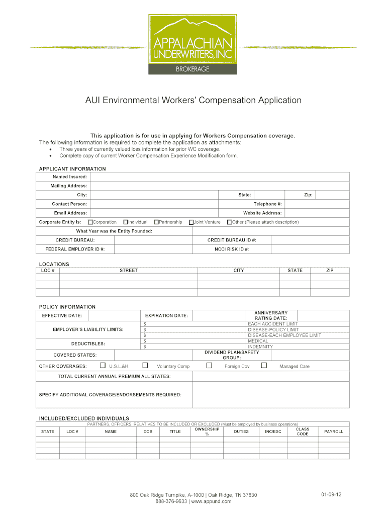AUI Environmental Workers Compensation Application ENVIRONMENTAL WORKERS COMPENSATION APPLICATION This application is for use in applying for Workers Compensation coverage. The following information