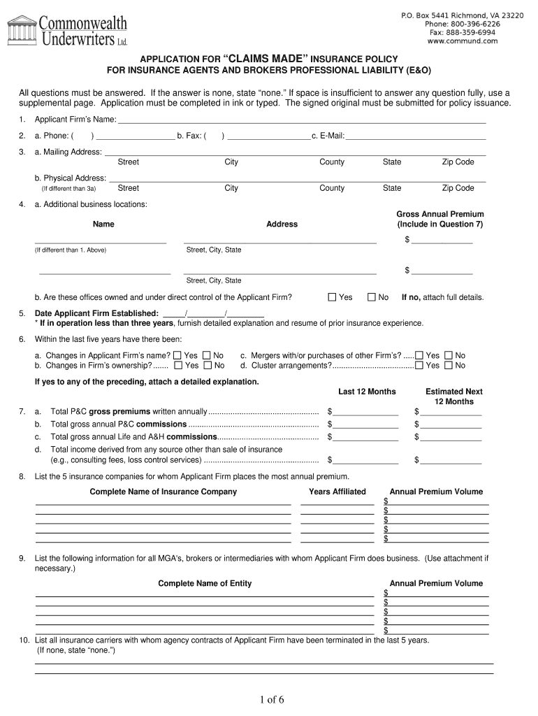 Lexington Insurance Company Middle Market Insurance Agents & Brokers APPLICATION FOR CLAIMS MADE INSURANCE POLICY FOR INSURANCE AGENTS AND BROKERS PROFESSIONAL LIABILITY (E&O) All questions must be