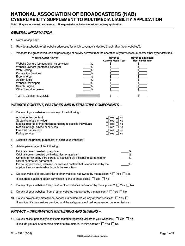 NATIONAL ASSOCIATION OF BROADCASTERS (NAB) CYBERLIABILITY SUPPLEMENT TO MULTIMEDIA LIABILITY APPLICATION Note: All questions must be answered. All requested attachments must accompany application.