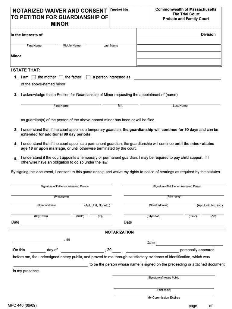 NOTARIZED WAIVER AND CONSENT TO PETITION FOR GUARDIANSHIP OF MINOR Commonwealth of Massachusetts The Trial Court Probate and Family Court Docket No. Division In the Interests of: Middle Name First