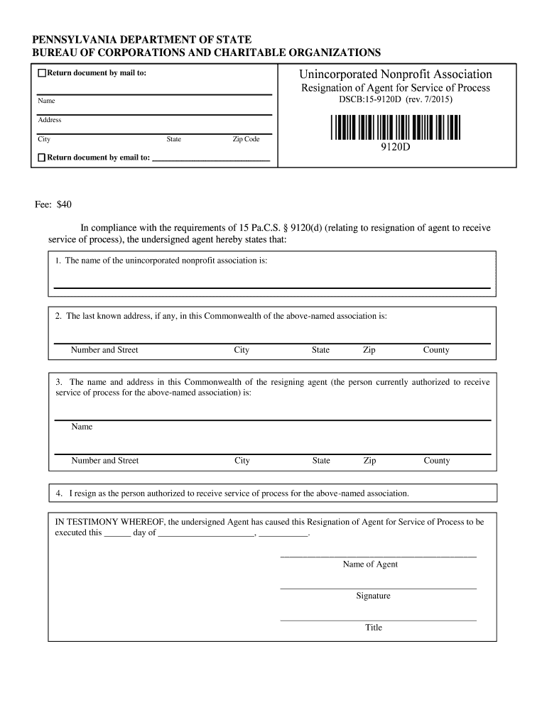 PENNSYLVANIA DEPARTMENT OF STATE BUREAU OF CORPORATIONS AND CHARITABLE ORGANIZATIONS Unincorporated Nonprofit Association Return document by mail to: Resignation of Agent for Service of Process DSC:159120D