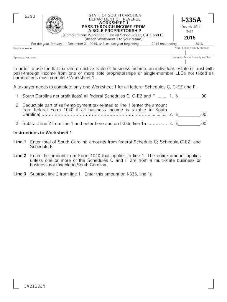1350 STATE OF SOUTH CAROLINA DEPARTMENT OF REVENUE I335A WORKSHEET 1 WALKTHROUGH INCOME FROM A SOLE PROPRIETORSHIP (Complete one Worksheet 1 for all Schedules C, CEA and F) (Attach Worksheet 1 to
