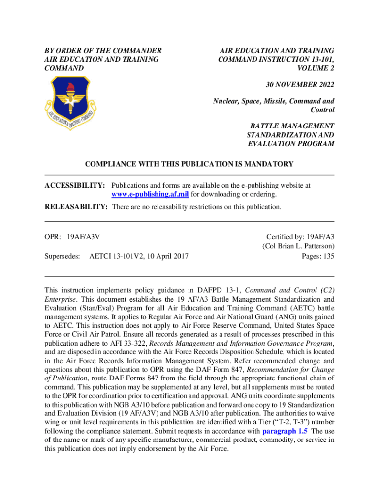 BY ORDER OF THE COMMANDER AIR EDUCATION AND TRAINING COMMANDER EDUCATION AND TRAINING COMMAND INSTRUCTION 13101, VOLUME 2 30 NOVEMBER 2023 Nuclear, Space, Missile, Command and Control BATTLE MANAGEMENT