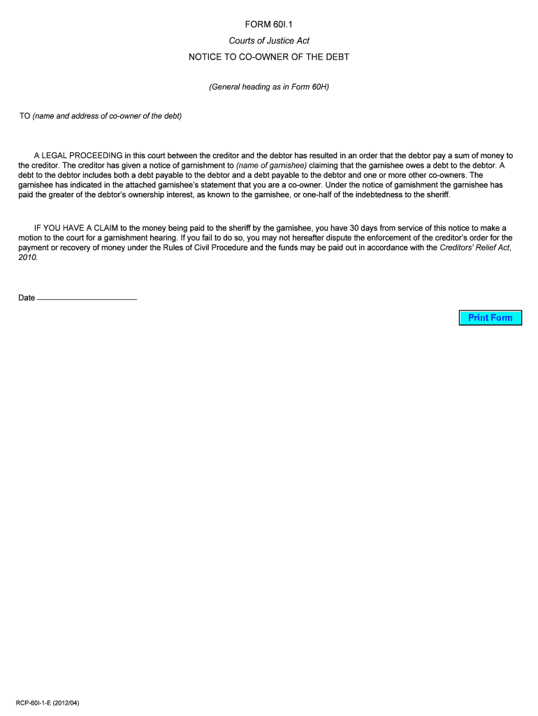 FORM 60I.1 Courts of Justice Act NOTICE TO CORNER OF THE DEBT (General heading as in Form 60H) TO (name and address of coowner of the debt) A LEGAL PROCEEDING in this court between the creditor and