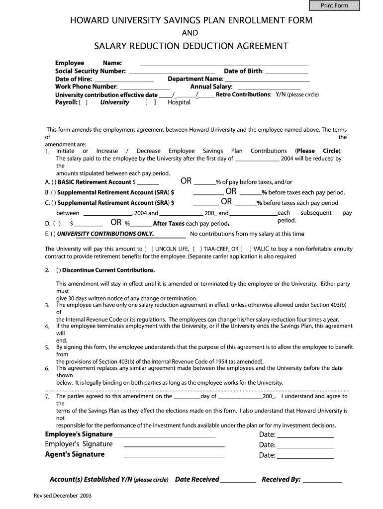 The Howard University Savings Plan Enrollment Form is a payroll document used by employees to enroll in or amend their retirement savings plan contributions.