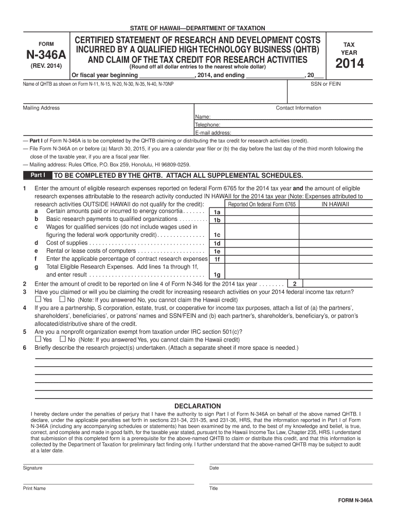 Clear Form STATE OF HAWAIIDEPARTMENT OF TAXATION FORM N346A CERTIFIED STATEMENT OF RESEARCH AND DEVELOPMENT COSTS TAX INCURRED BY A QUALIFIED HIGH TECHNOLOGY BUSINESS (HTB) YEAR AND CLAIM OF THE TAX