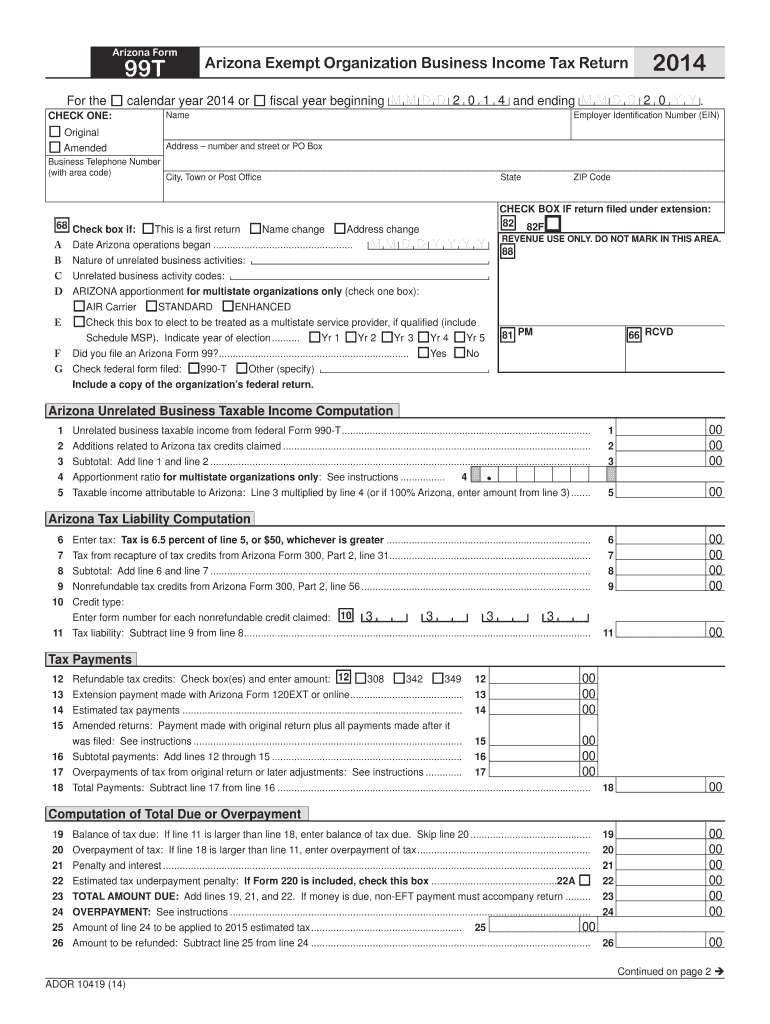 Arizona Form 99T Arizona Exempt Organization Business Income Tax Return 2014 For the calendar year 2014 or fiscal year beginning M D 2 0 1 4 and ending M D 2 0 Y. CHECK ONE: Original Amended Business