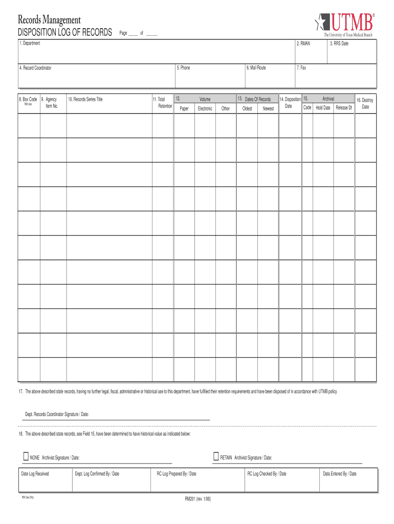 Records Management DISPOSITION LOG OF RECORDS Page of 1. Department 2. MAN 8. Box Code RM Use 9. Agency Item No. 6. Mail Route 5. Phone 4. Record Coordinator 10. Records Series Title 11. Total Retention
