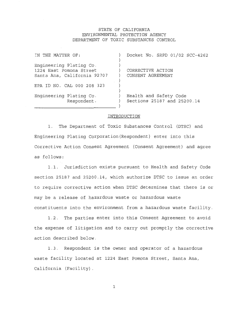 STATE OF CALIFORNIA ENVIRONMENTAL PROTECTION AGENCY DEPARTMENT OF TOXIC SUBSTANCES CONTROL IN THE MATTER OF: Engineering Plating Co, 1224 East Pomona Street Santa Ana, California 92707))))) Docket