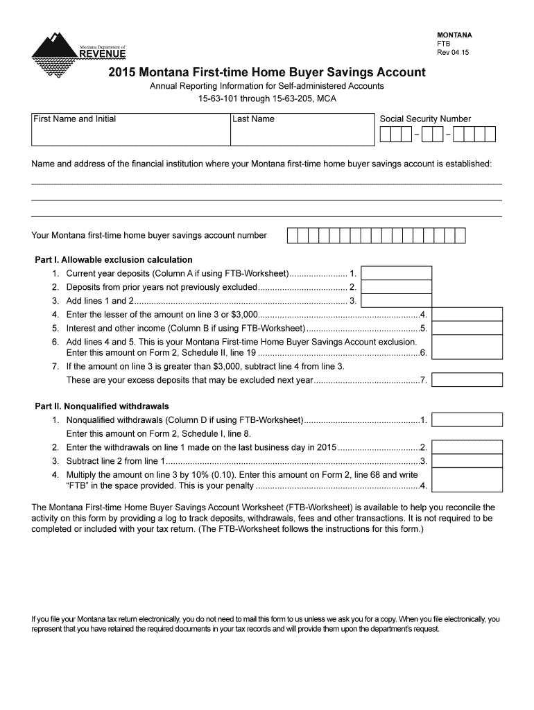 CLEAR FORM MONTANA FT Rev 04 15 2015 Montana First-time Home Buyer Savings Account Annual Reporting Information for Self-administered Accounts 15-63-101 through 15-63-205, MCA First Name and Initial