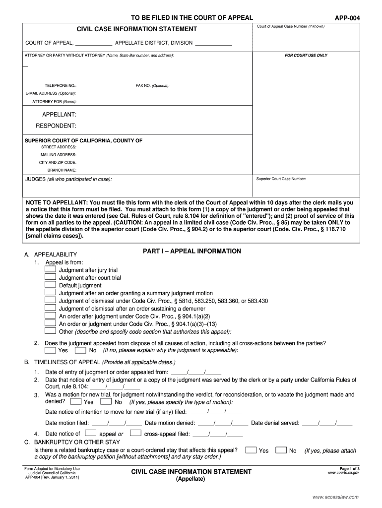Change Document Font Size Manual Typewriter Check Spelling Email Form Save Form TO BE FILED IN THE COURT OF APPEAL CIVIL CASE INFORMATION STATEMENT + COURT OF APPEAL, APP004 Court of Appeal Case Number