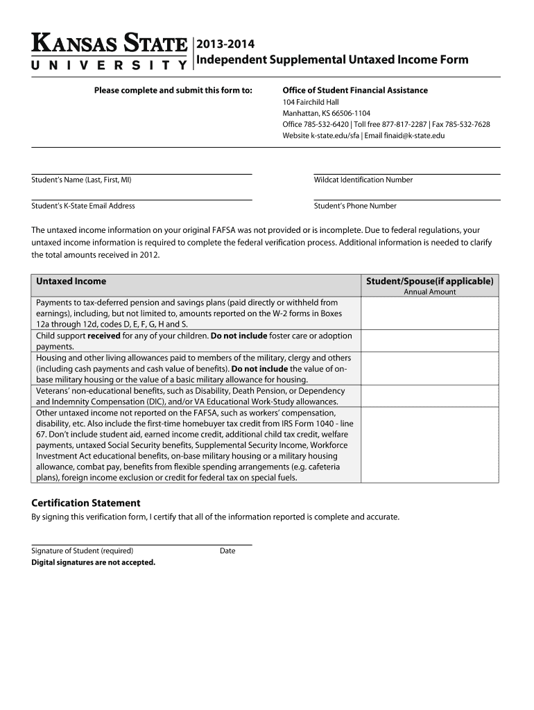The form is primarily for independent students attending Kansas State University who need to report their untaxed income for FAFSA verification. Students must ensure they fall into this category before using the form.