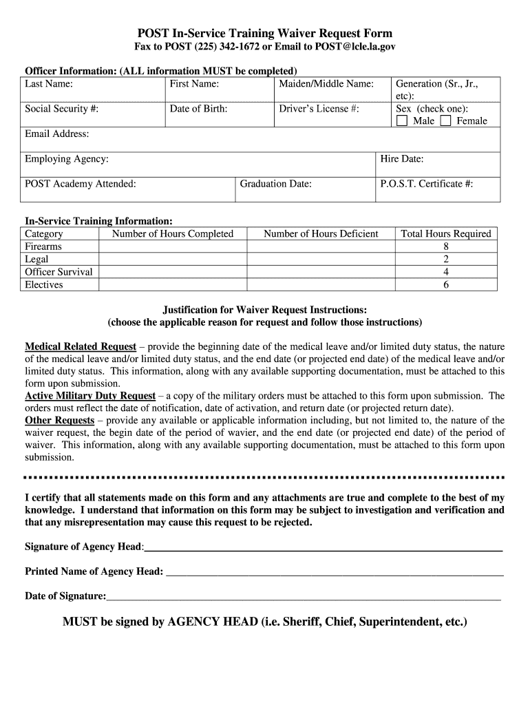 POST In-service Training Waiver Request Form Fax to POST (225) 3421672 or Email to POST Lyle.la.gov Officer Information: (ALL information MUST be completed) Last Name: First Name: Maiden/Middle Name: