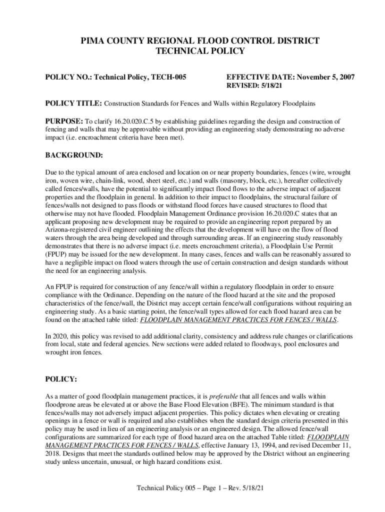 PIMA COUNTY REGIONAL FLOOD CONTROL DISTRICT TECHNICAL POLICY NO.: Technical Policy, TECH005EFFECTIVE DATE: November 5, 2007, REVISED: 5/18/21POLICY TITLE: Construction Standards for Fences and Walls