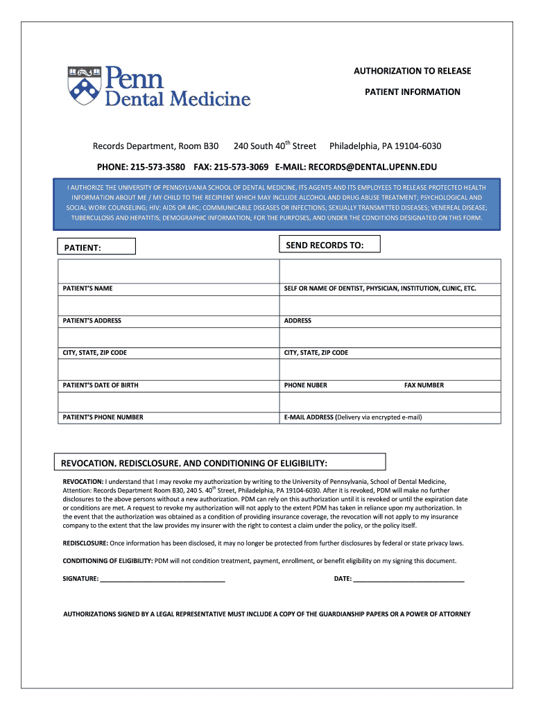 AUTHORIZATION TO RELEASE PATIENT INFORMATION Records Department, Room B30 240 South 40th Street Philadelphia, PA 19104-6030 PHONE: 215-573-3580 FAX: 215-573-3069 E-MAIL: RECORDS DENTAL.PENN.EDU I