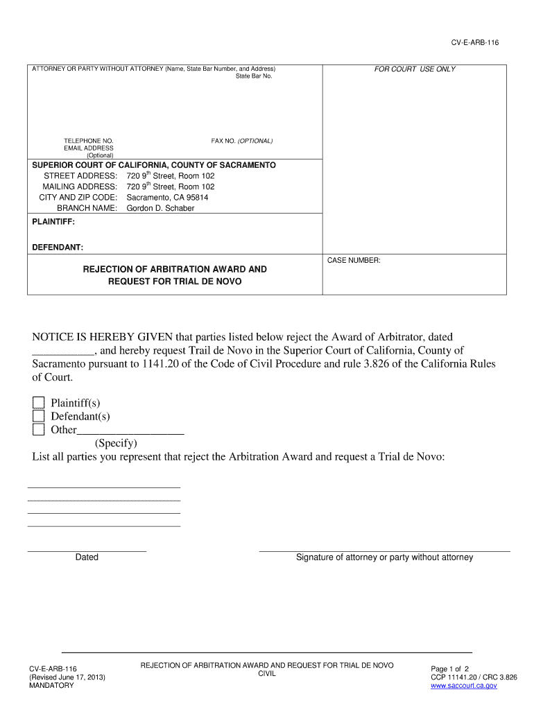 CVEARB116 ATTORNEY OR PARTY WITHOUT ATTORNEY (Name, State Bar Number, and Address) State Bar No. TELEPHONE NO. EMAIL ADDRESS (Optional) FOR COURT USE ONLY FAX NO. (OPTIONAL) SUPERIOR COURT OF CALIFORNIA,